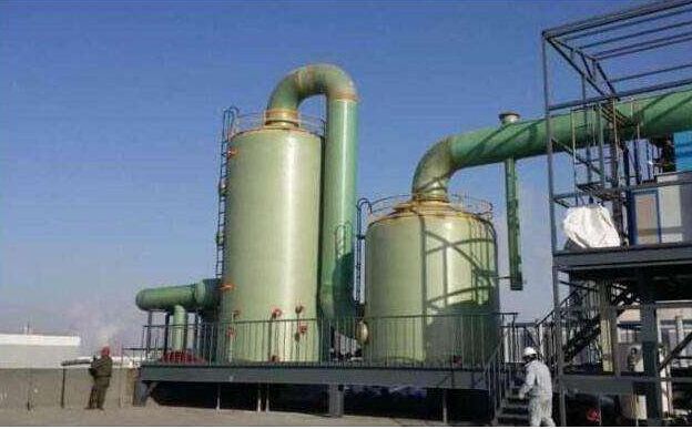 2、已被凍結的熱煙氣通過玻璃鋼脫硫塔的除霧器進入二氧化硫吸收塔。在二氧化硫吸收塔中,氨和水混合會形成氨液。煙氣中的二氧化硫在此過程中會被吸收,與氨反應生成硫酸銨。